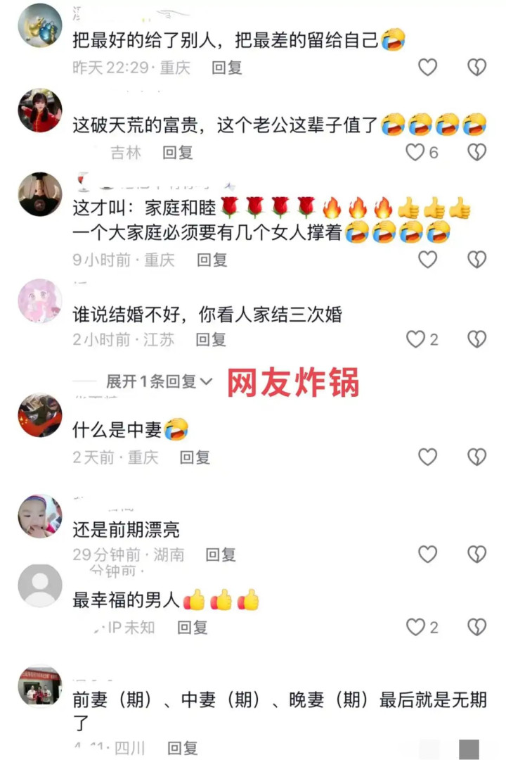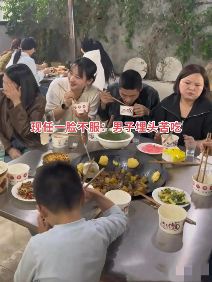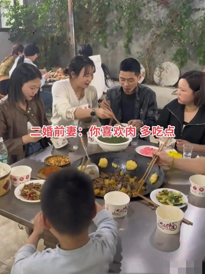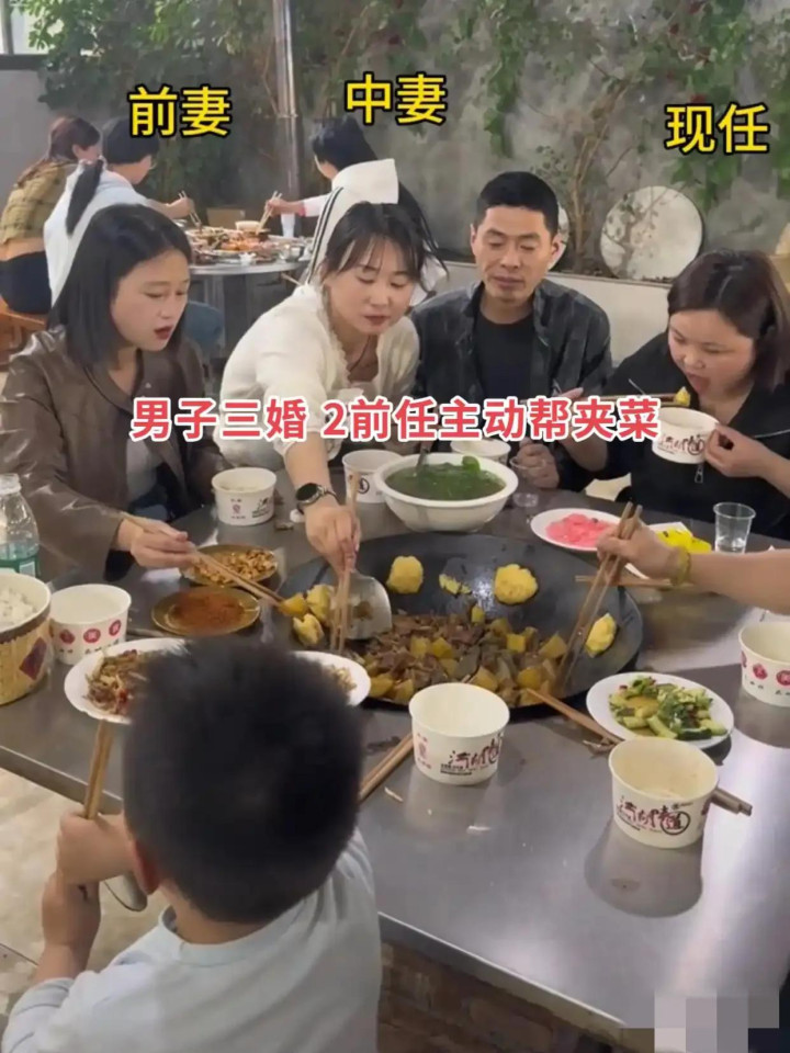 在四川某个地方,今年三月底的时候,有人拍下一场饭局的情景,李某四十二岁,他和现在的妻子、还有两位前妻一起坐在桌边吃饭,视频里,两个前妻穿得挺讲究,一个穿着皮衣,另一个是小香风套装,她们轮流给李某夹土豆和鸡肉,说话也很亲近,现任妻子穿着一件深色宽松外套,她一直没怎么动筷子,脸绷着,一句话也没说,李某后来在朋友圈发了这个视频,还开玩笑说两个前妻太热情了,菜都不敢吃了,顺便把三个人叫成前妻、中妻和现任,这件事很快就火了,一天播放量有八百多万。